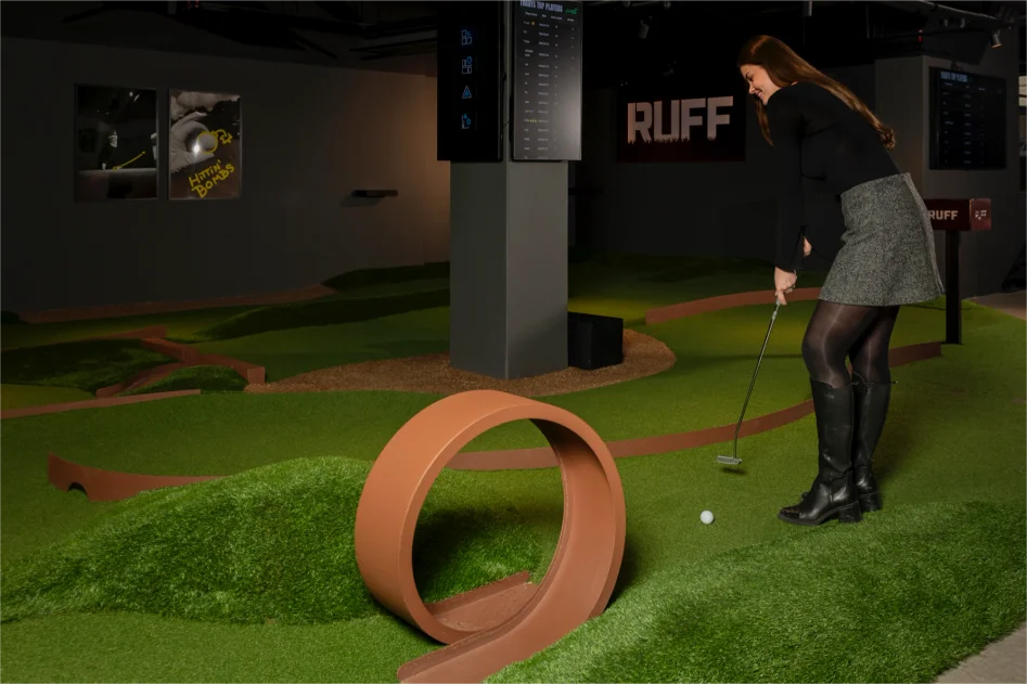En minigolfbana kanske inte är det du förväntar dig att hitta mitt på Drottninggatan i centrala Stockholm, men RUFF är inget vanligt minigolfställe. Den 18-håliga minigolfbanan bjuder på spännande och roliga utmaningar för såväl inbitna spelare som nybörjare och här spelar både familjer, kompisgäng och after work-sällskap sida vid sida.